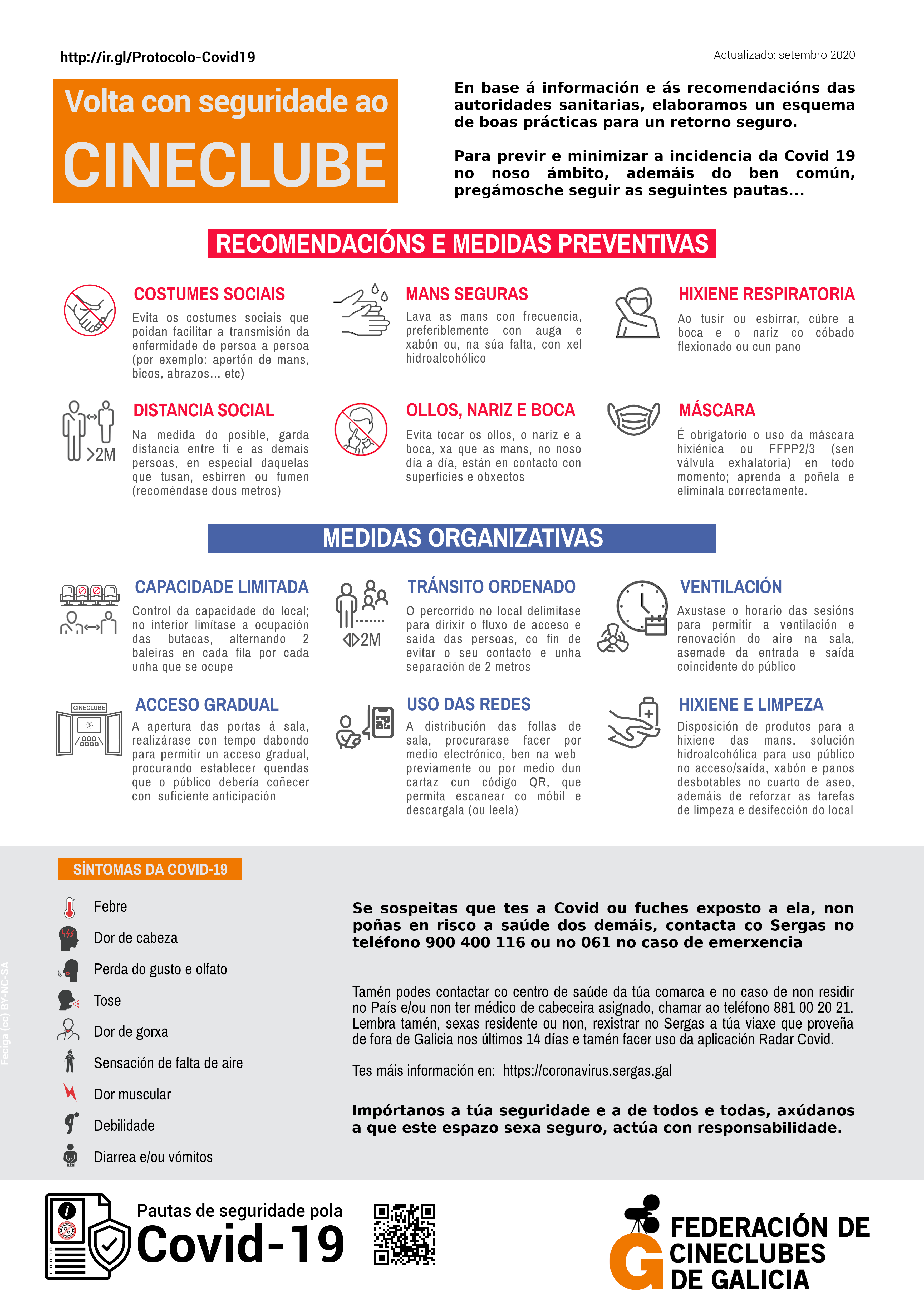 En base á información e ás recomendacións das autoridades sanitarias, os cineclubes de Galicia elaboraron un esquema de boas prácticas para un retorno seguro a súas actividades. Dito documento (en permanente actualización) está disponíbel para a súa consulta (e descarga) no enderezo: